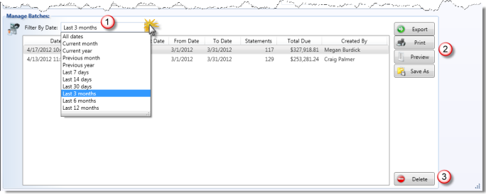 The Manage Batches area allows you to search for previously-generated batch files. Use the Export, Print, Preview or Save As options to recreate your batch files. Use the Filter By Date drop-down menu to quickly search for batch files by creation date.