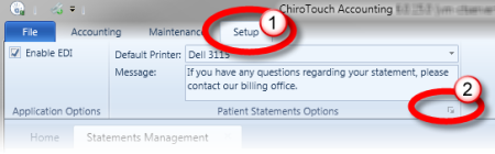 Click the Setup tab in the Accounting ribbon when viewing the Statements Management screen. From this menu, you can set your default printer or edit the message that appears on your printed patient statements.