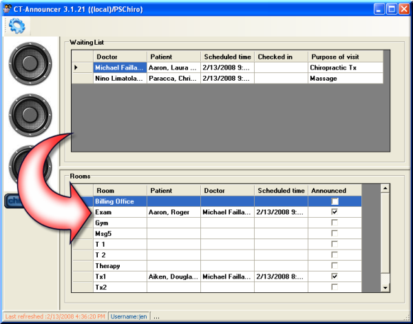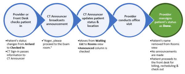When the doctor or front desk checks a patient into a room, the patient’s status changes from Arrived to Checked In. This change in status prompts CT Announcer to take two actions: First, CT Announcer broadcasts an announcement to the patient, stating the patient’s name and directing them to the specified room. For example, the announcement sounds as follows: “Jim, please proceed to the Exam room”.
