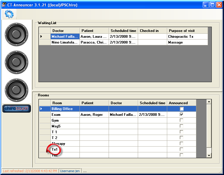Here, the Rooms view shows that Roger has been announced and sent to the Exam room. As we can see, there are currently patients in both the Exam room and Treatment Room 1 (Tx1).
