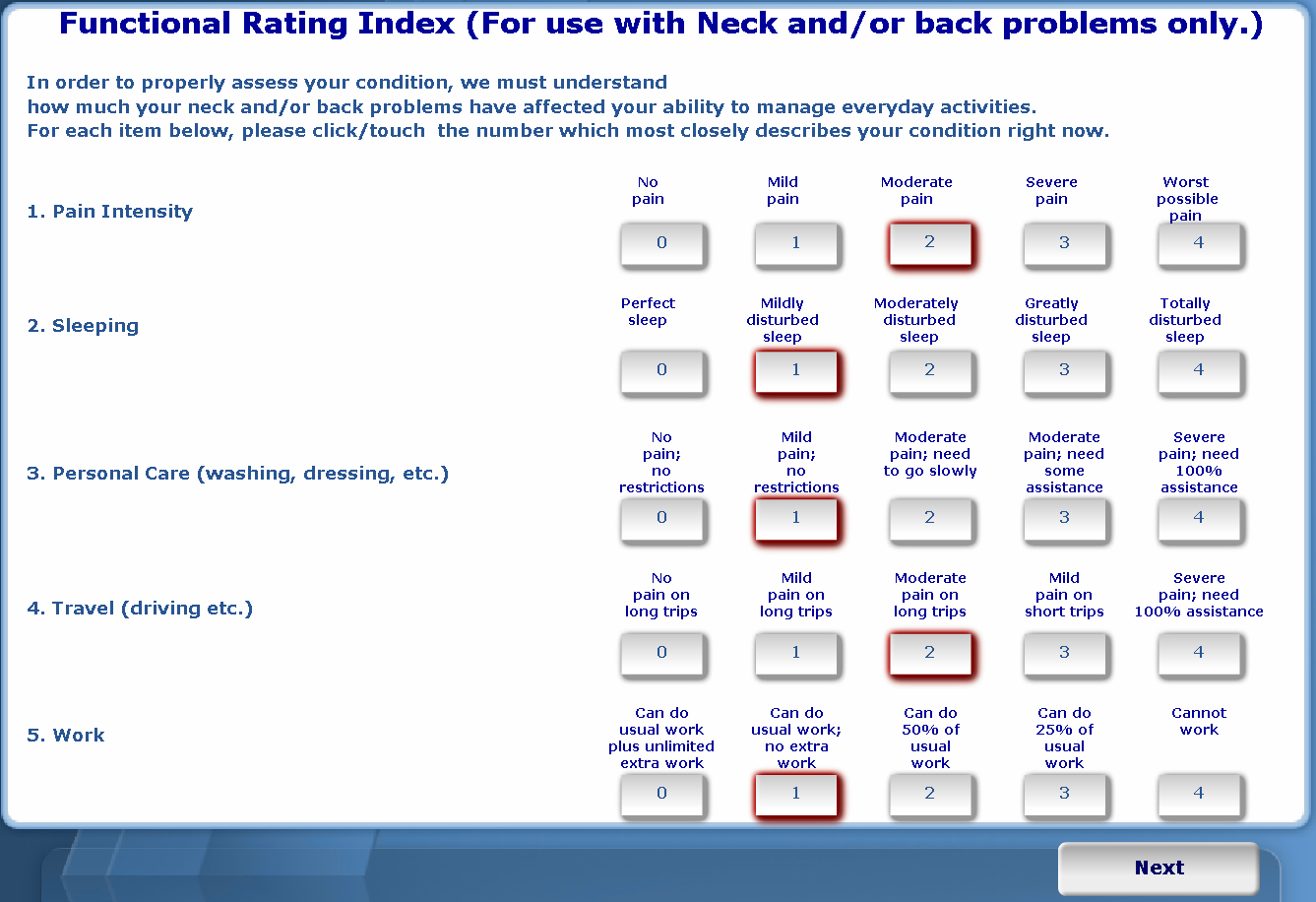 After the Subjective Complaint screens are complete, the Functional Rating Index asks the patient specific questions about the areas of discomfort they indicated. Answer the questions and click Next to go to the next screen. When finished, click Touch Here When Finished.