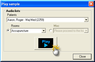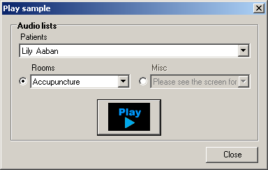 - The Play sample dialog box appears. Use this dialog box to play combinations of samples of patient names with rooms and miscellaneous greetings.