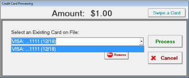 If there is more than one card on file, you may select from a list of existing cards on file for that patient. Select the card you would like to use from the list, and then click Process.