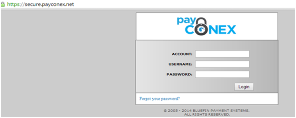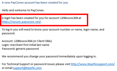 The second welcome e-mail is from sender “noreply@bluefin.com” with the subject “A new PayConex account has been created for you”. This e-mail contains your username and password, and it will arrive 1-2 days after the initial Welcome email.