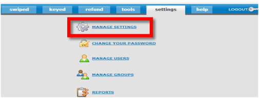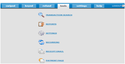 From this page you can search your transactions, generate reports (such as transaction history and search, daily card totals, and event log) manage recurring charges, set your receipt e-mail, or adjust your payment page.
