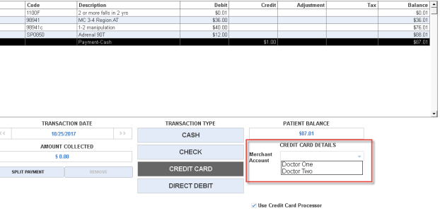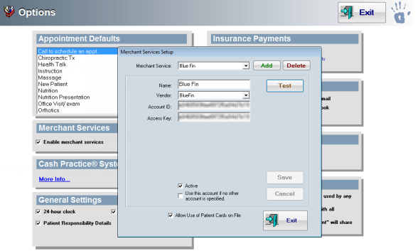 If you would like to set up multiple Bluefin accounts, you must assign them different names in the ChiroTouch Maintenance > Options > Merchant Services Setup screen. For example, DoctorOneBluefin and DoctorTwoBluefin.