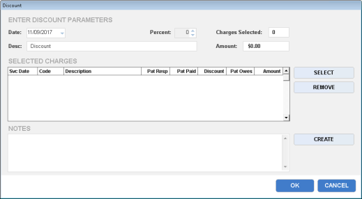 10. (Optional) Type additional notes in the Notes text field, or click the Create button to have the system automatically enter a note detailing the discount being applied. You may edit this note in the Notes text field.