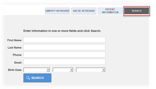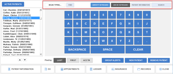 You have the option to set up the on-screen keyboard in either ABCDEF fashion, or in standard computer QWERTY fashion. Choose whichever layout is more comfortable for you. If you would like to see the patient’s information displayed instead of the on-screen keyboard, click the Patient Information button in the upper right-hand corner of the screen. You can also search for your patients by phone number or other identifier by clicking the Search button.