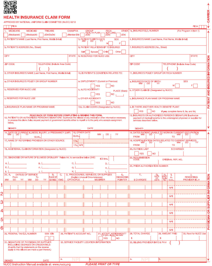 Click any box on the claim form below for a guide to entering this information in ChiroTouch. ChiroTouch cannot advise you of what information goes into any box on the claim form, as state-to-state and insurance company to insurance company requirements vary. This document is to be used as a map that will show you where to input the information as it populates on your 1500 HCFA Claim Form.