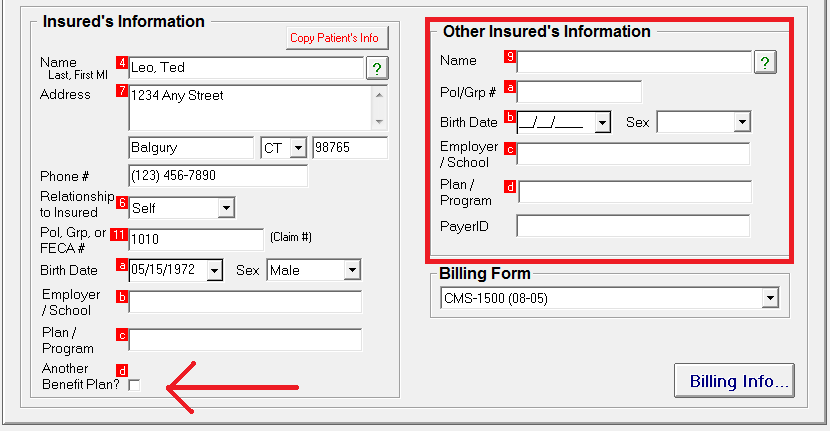 Box 9 references a secondary insurance policy. Here you will enter the insured’s information (either spouse, parent, or patient information) to inform the insurance company that this patient has a secondary insurance. If the patient has a secondary insurance plan, be sure to mark box 11-d on this Insured's / Other Insured's Information screen.