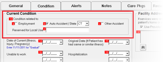 Box 10 explains if the patient's condition is related to an auto accident, work injury, or any other accident. To access the information in this box, go to Front Desk > Patient Mgmt > Pat. Info. Then select the Condition tab.