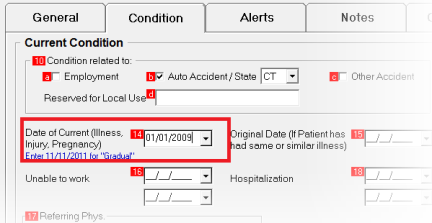 The condition tab DOES NOT POPULATE THE DATE OF CURRENT ILLNESS ON THE CLAIM FORM. It is used as a reference point only. Box 14 populates from the patient's Diagnosis screen for each appointment.