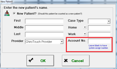 The account numbers are unique to each patient file in ChiroTouch. You can assign your own account number to each person when entering the new patient information into the system or ChiroTouch will assign an account number for you.