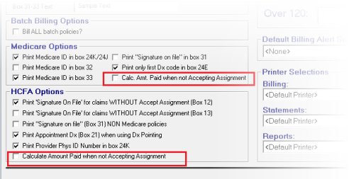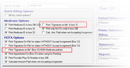 - Select the option "Print 'Signature on File' (Box 31) NON Medicare policies" in the HCFA Options section.
