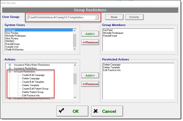 Because InTouch is now a ChiroTouch application, you can control user permissions within your ChiroTouch office network using your Maintenance security settings. For example, you may want to create a group of ChiroTouch users in your office who can create and modify campaigns or templates but are not allowed to delete them, as shown in the example below.