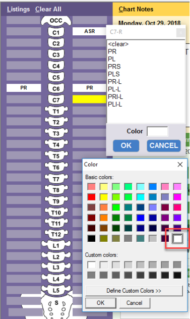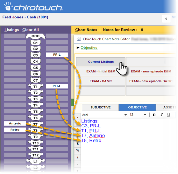 The Listings section displays a visual reference of individual spinal segments, or a body image. You will create reference notes by inserting findings to the right and left of each segment. This section is designed to act as a virtual drawing board for posting notes on directions of misalignment and corrective adjustment.