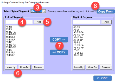 - Select a spinal segment using the drop-down Select Spinal Segment menu. The lists for the Right of Segment and Left of Segment will reflect the spinal segment you selected from the drop-down menu.